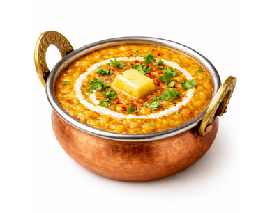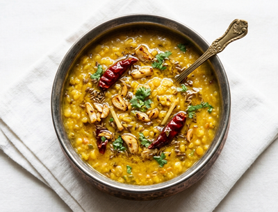Yellow lentils tempered with garlic, cumin, chilies in ghee, smoky aroma, classic homestyle dish.