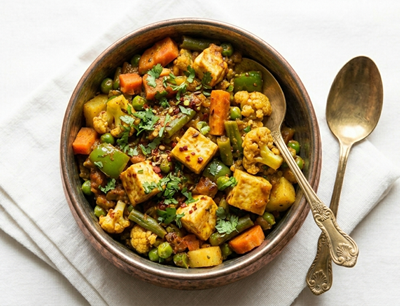 Mixed vegetables with spices, paneer, colorful, lightly spiced, healthy, flavorful Indian dish.