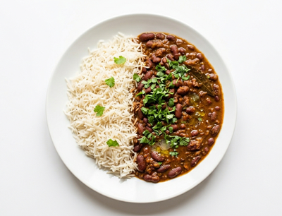 Hot, fluffy basmati rice served with rich, flavorful rajma curry, topped with fresh coriander