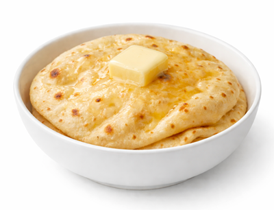 Soft tawa roti topped with melted butter, enhancing taste and richness.